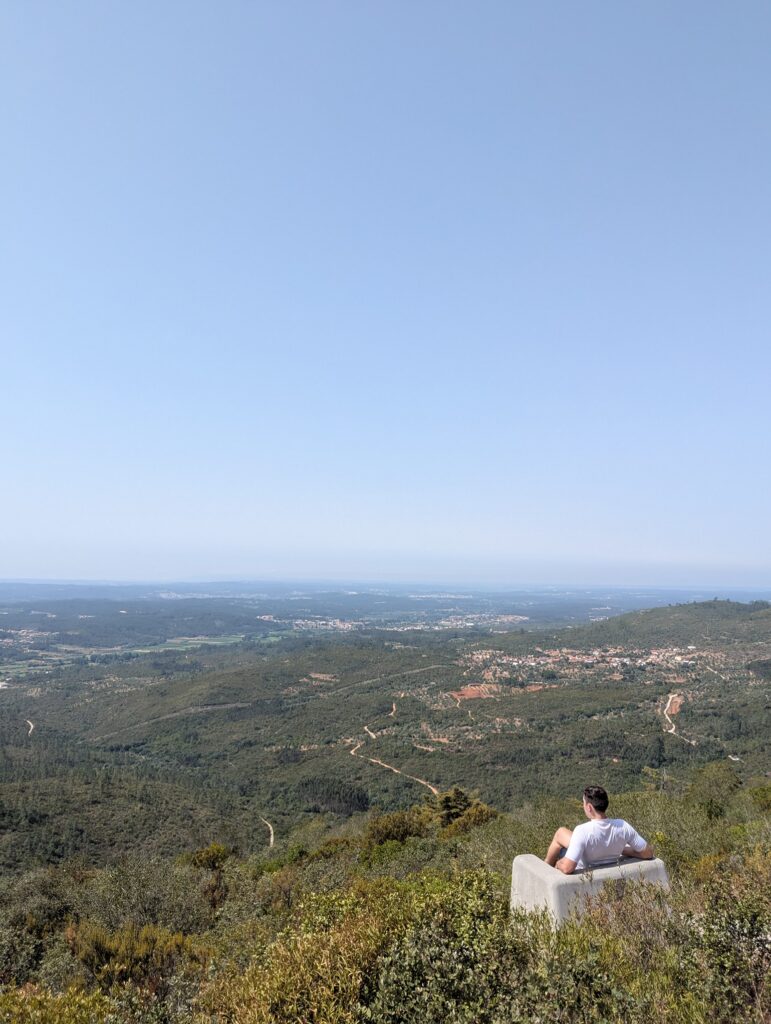 Perched above the tiny mountain village of Poios, near Redinha in the Pombal municipality, this is one of those quiet local gems that doesn’t appear on tourist maps but immediately makes sense the moment you arrive. Someone thought: this view deserves more than a quick stop. So they built a place to sit.